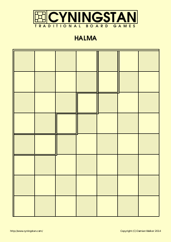 Halma is a race game without luck, invented in the 1880s by American George Howard Monks. Two or four players strive to be the first to race their pieces diagonally across the board, the rules allowing pieces to help one another to move quickly if positioned with sufficient skill.