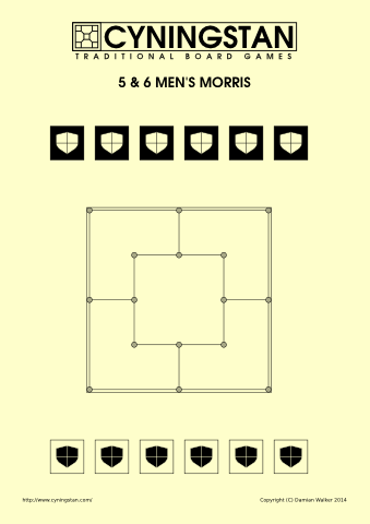 Five men's morris and six men's morris are smaller versions of the popular nine men's morris game. These smaller variants were popular mainly in Europe just after the mediaeval period. Both are played on the same board, so they are combined into a single print-and-play file.