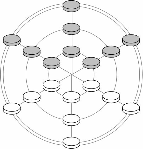 This attractive variant of alquerque, a forerunner of draughts, was played in Bihar in India. Its board is of three concentric circles joined by six spokes, the spokes not meeting in the middle. A variant with 7 concentric circles was also played. Though nowhere stated in Western accounts of the game, it is assumed that one piece may jump over another along a curved line.