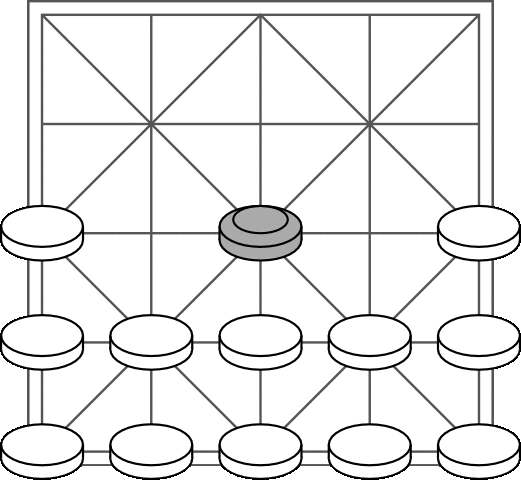 2. One player starts with a single piece, the hare, while his adversary has twelve hunters, all arranged on the board as shown in the diagram.