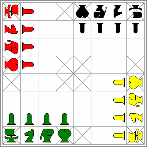 14. If one player from each partnership has captured the other enemy’s king, e.g. if black has captured red’s king and yellow has captured green’s king, then the capturing players may agree to an “exchange of kings”. The captured kings are then returned to their owners, and placed on their starting squares, or as near as possible if those squares are occupied.