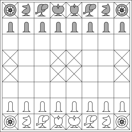 - Each player has sixteen pieces of his own colour: 1 raja, 1 vizier, 2 elephants, 2 horses, 2 chariots and 8 pawns. At the start of the game, they are laid out on the board as in the diagram.