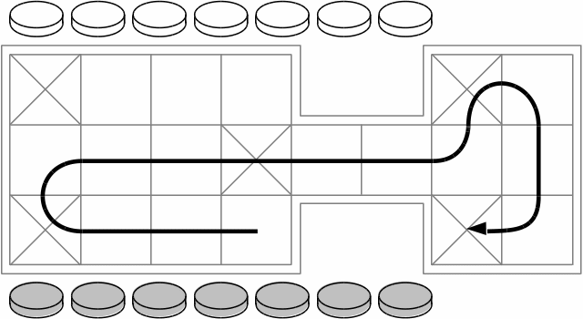 5. The path of a player's pieces starts on his side of the board, in the large block, at the square nearest the bridge. The piece moves toward the corner with the rosette, before moving to the adjacent square on the middle row and continuing till it crosses the bridge. Once across the bridge, it moves to the rosette on the opponent's side, then curves around the small block till reaching the rosette at the player's own side, from which it is borne off. The path is simpler than it sounds: see the diagram.