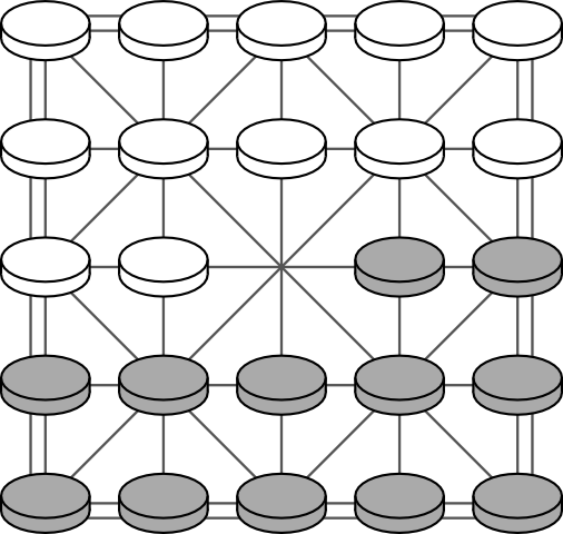 1. The game is played on a board of five points by five, the points being joined by horizontal and vertical lines in a lattice pattern, with some diagonals added as in the diagram.