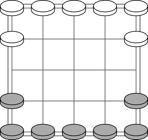 Five field Kono is a game from Korea, of unknown antiquity but first recorded in the west in 1895. Two players each try to get their pieces across the board to the opposite side. The first to occupy the starting positions of his opponent wins the game.