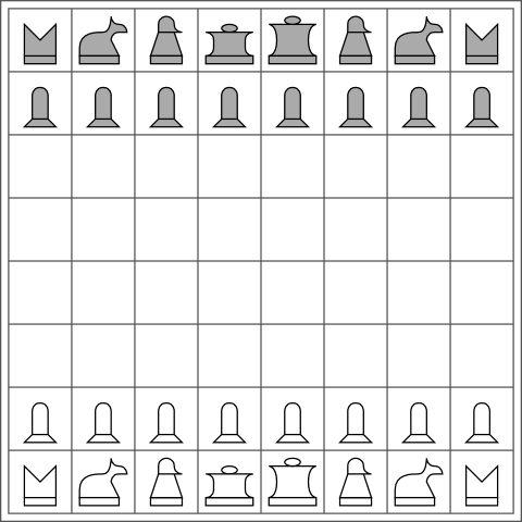 3. Each player has sixteen pieces of his own colour: 1 king, 1 vizier, 2 elephants, 2 horses, 2 chariots and 8 pawns. At the start of the game, they are laid out on the board as in the diagram.