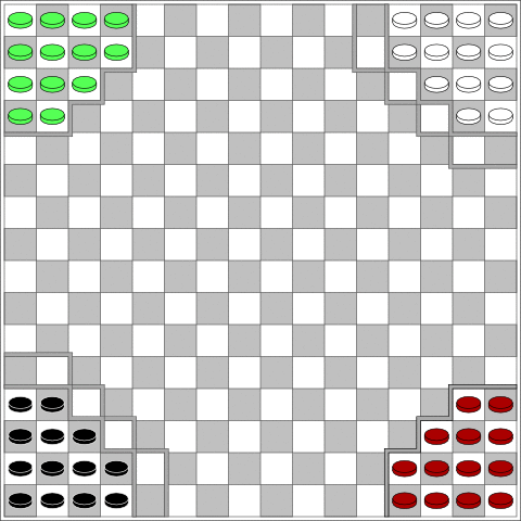 3 . Alternatively, four players each have 13 pieces in the smaller marked areas in each corner of the board.