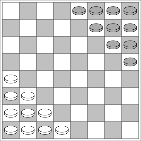 2. On an 8x8 board, the players have ten pieces each, set out in opposite corners as shown in the diagram.