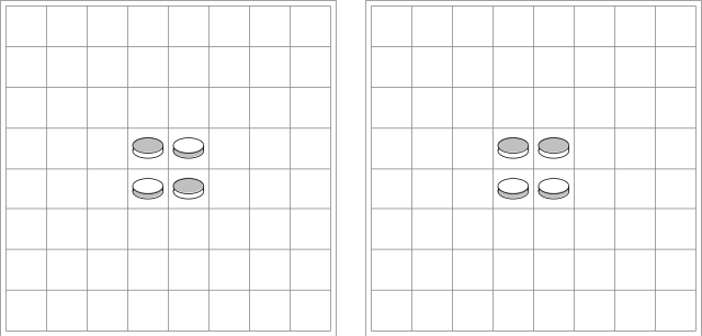 4. In the initial phase of the game, the four central squares must be filled. White places a piece in one of them, white face upwards. Black places a piece in another of them, black face upwards.