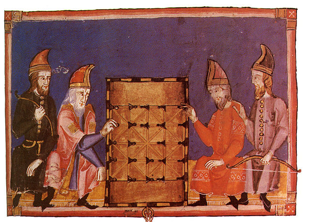 Libro de los Juegos (The Book of Games) was commissioned in 1283 by Alfonso X of Castille, Galicia and León. Its 97 leaves of parchment are divided into games of skill like chess, games of pure chance like dice, and games which combine both, like backgammon. It contains many illustrations, and gives us some information about mediaeval games not recorded elsewhere.