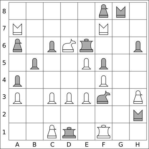 Castling and en-passant moves are unknown. A pawn always promotes to a queen. Stalemate is a loss for the trapped player, and if one side is reduced to only a king then that player has lost the game.