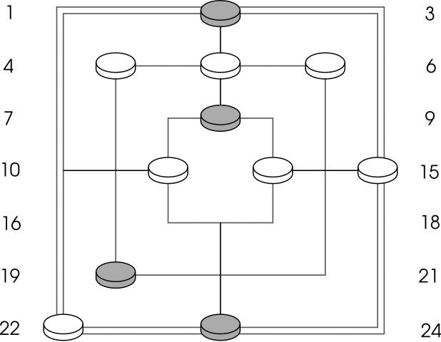 4 - 11 is a superior move for white during the normal course of the game, since black is blocked out of a mill. However, flying makes both 22 - 10 and 4 - 11 equal moves during the endgame. Endgame victories generally requires two open mills and the opponent to have no partial mills. Black must move 19 or 23 to 20. 23 - 20 is better, since the move obstructs white a little. White must remove 20 (or 19, 23) to avoid a mill from black. In addition to the two open mills white needs a third mill to remove black's fourth piece.